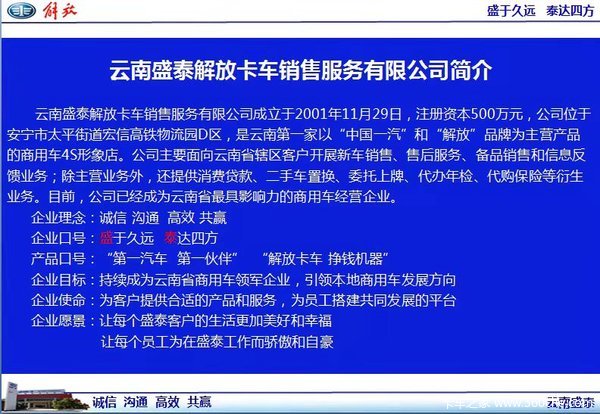 云南盛泰解放卡车销售服务有限公司成立于2001年11月29日,是云南省第一家卡车4S店,也是解放品牌在云南省的首家4S形象店。公司遵循盛于久远、泰达四方的企业使命,秉承诚信、沟通、高效、共赢的企业理念,目前已经成为西南地区实力最强、影响最广的卡车经销商之一。公司每年都获得明星经销商、优秀代理商、功勋经销商、明星服务站等荣誉称号,其中,2010年获得的功勋代理商是迄今为止西部省份唯一获得此殊荣的代理商(全国只有十家)。