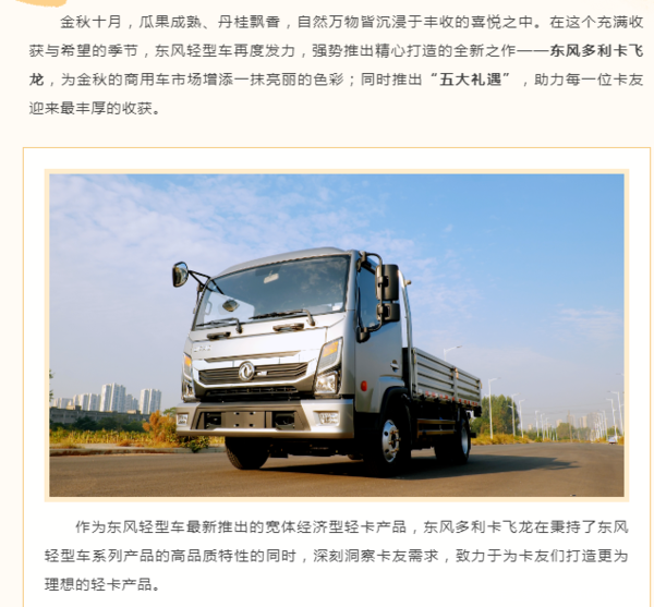 当前位置: 卡车之家 >卡车经销商 > 长春瑞洋汽车销售服务 > 促销新闻 > 东风多利卡飞龙金秋上市福利拉满,助力卡友实现丰收