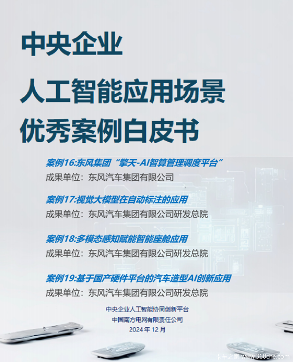 当前位置: 卡车之家 >卡车经销商 > 长春瑞洋汽车销售服务 > 促销新闻 > AI赋能!东风汽车4项成果入选央企人工智能白皮书