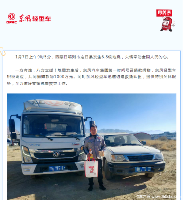 当前位置: 卡车之家 >卡车经销商 > 长春瑞洋汽车销售服务 > 促销新闻 > 紧急驰援西藏日喀则地震灾区,东风轻型车暖心护航,同心抗灾