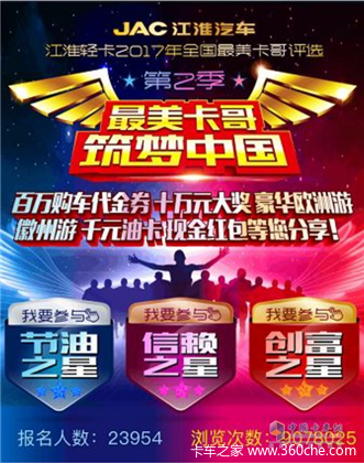 江淮轻卡“最美卡哥 筑梦中国”第二季评选活动将迎来创富之星组的终极pk和最终的总决赛颁奖盛典。该活动自去年9月1日启动至今,共吸引了来自全国31个省市近24000名江淮轻卡用户报名参赛,活动页面访问数超过907万次。随着两季活动的持续开展,江淮“最美卡哥筑梦中国”已形成了具有江淮特色的、在行业内极具影响力的评选活动。