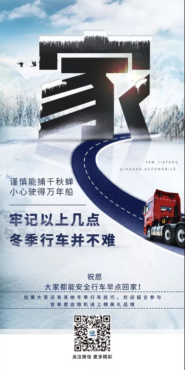 冬季环境复杂,卡友们在出车前请做好车辆检查,检查灯光、胎压、更换三液(防冻液、玻璃水、机油)。