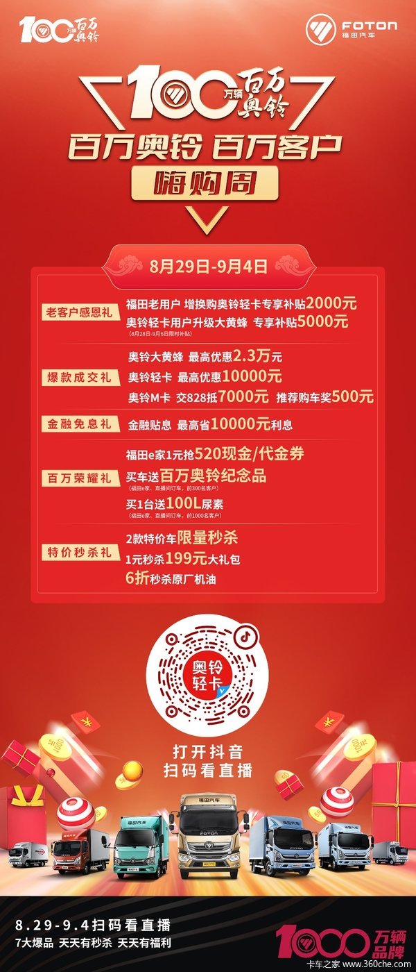 8月29日-9月4日,7大爆品,天天有秒杀,天天有福利,不同车型有不同优惠。想要了解更多奥铃优惠政策,扫描二维码,福利等你来拿!