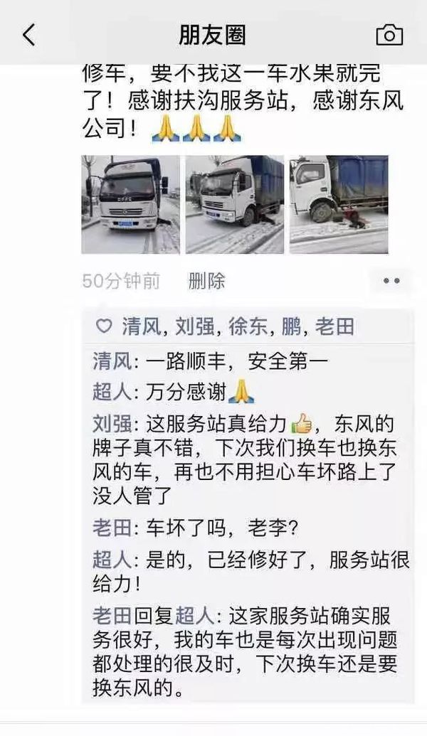 东风轻型车收到的朋友圈实名表扬可不止上面的李师傅一个,最近这段时间,凭着这种敬业精神,东风轻型车服务技师们收到的表扬可就像是“朋友圈自来水”源源不断!