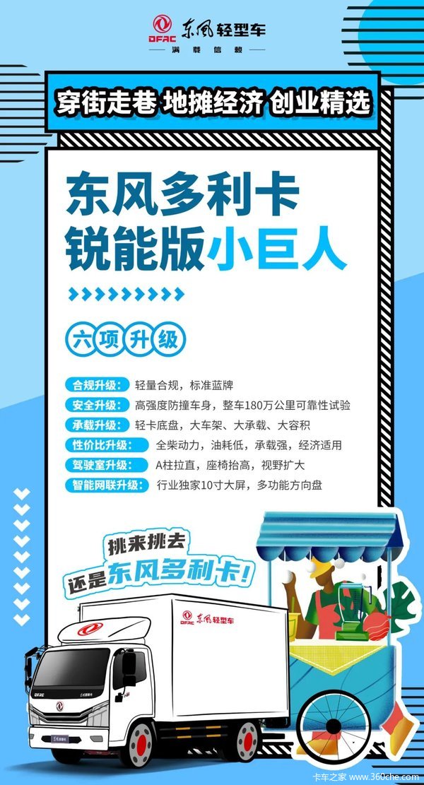东风多利卡锐能版小巨人,轴距仅2.8米,真正的小身材大用途。全车采用多项科学减重措施,在非承载部位大量采用铝合金、镁铝合金、高分子复合材料、高强度钢板等高强度、轻量化材料,减重不减质,轻量又可靠。标准蓝牌进城,进小区都无忧。众所周知,一般摆摊的地方都拥挤不堪,掉头转弯十分麻烦,东风多利卡锐能版小巨人,重心低,转弯半径小,在狭窄路段掉头、转弯、停车都非常方便,可以减少不停换挡调整的次数,无形中节省了不少时间,也减少了更多安全隐患。