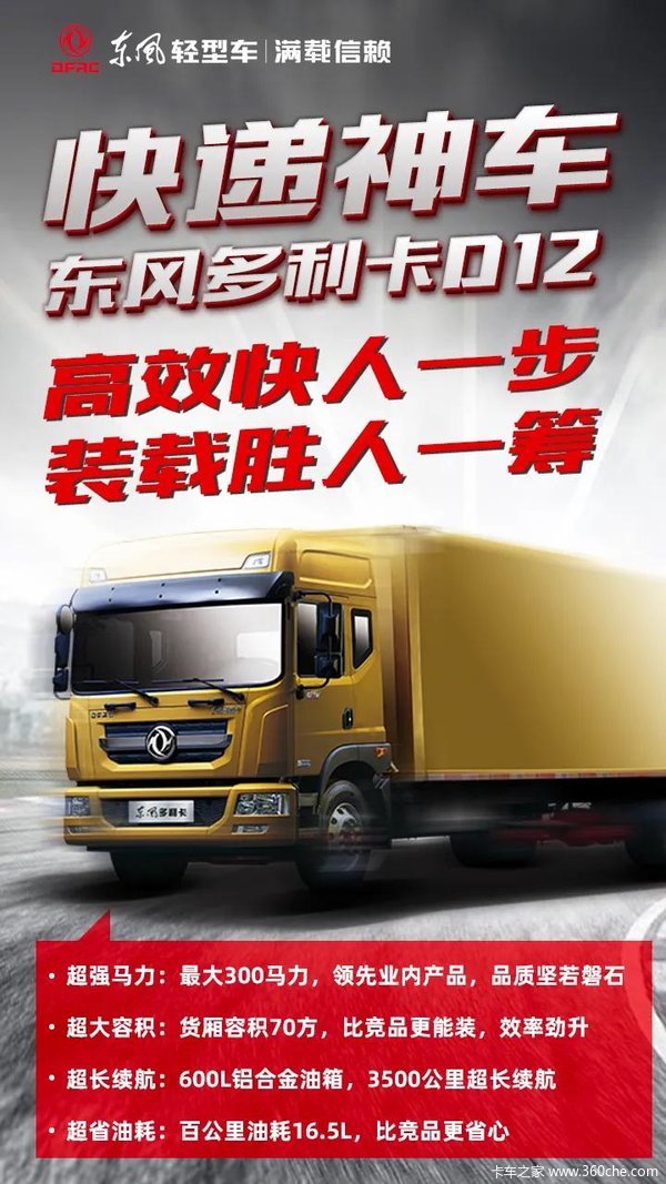 快递行业,最讲究的就是时效,因为延误就会带来不可避免的损失。而东风多利卡D12,搭载的康明斯ISD300系列发动力是世界知名动力,品质业界公认。其动力进一步升级,最大可达300马力,领先行业内同等发动机。