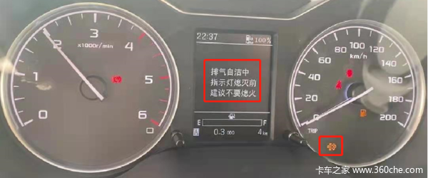 行车过程中仪表盘上再生指示灯被点亮,并伴随文字提示 “排气自洁中”, 表示发动机正处于颗粒捕集器DPF再生的工作中,此时严禁直接停机,应保持行驶或怠速,不要进入加油站及具有危险化学物品、粉尘、易燃易爆物品的场所,待仪表盘“排气自洁中”提示灯熄灭后才能停机,否则可能会对发动机后处理系统造成不可修复损伤,完整的再生过程大约持续20分钟左右。