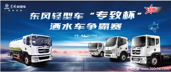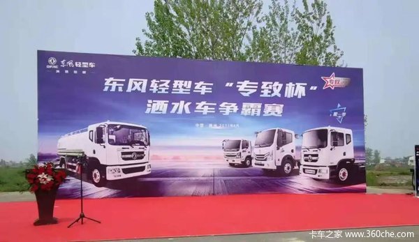 东风轻型车于4月13日,在专汽之都-随州隆重举办“专致杯”-洒水车争霸赛(第一季),现场邀约随州知名洒水车制造企业16家,派出各厂最高工艺车辆参展, 覆盖东风轻型车全系产品:东风多利卡、东风凯普特、东风途逸、东风小霸王共计34台,专用底盘,配备康明斯、玉柴、全柴、朝柴等国际知名动力,改装涵盖3方-14方全品类洒水车(含抑尘车、高压清洗车)。