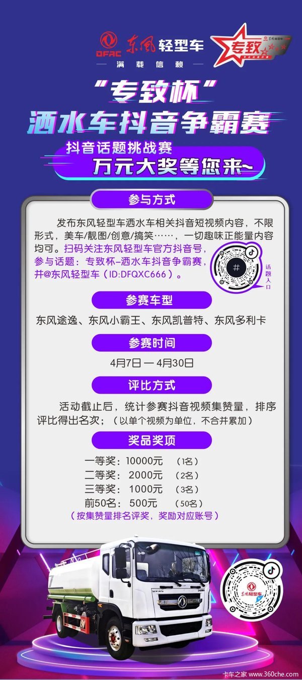 作为东风轻型车“专致”品牌第一季活动代表的“专致杯”洒水车争霸赛虽然已落下帷幕,但“专致杯”洒水车抖音争霸赛还在火热进行中,发布东风轻型车洒水车相关抖音短视频内容积赞,凭点赞数赢取万元大奖。未来东风轻型车“专致”品牌将持续不断散发活力,开展品牌互动活动,助力“专致”底盘改装洒水车销售挺进新的销售高峰。