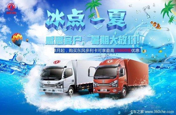 为回馈感恩新老用户,从8月份起到9月份,东风轻卡将联合全国各地上百家东风多利卡经销商们开展为期两个月的“感恩回馈客户,冰点价格来袭”的大放价活动。此次暑期“大放价”,优惠力度空前,绝对突破冰点。