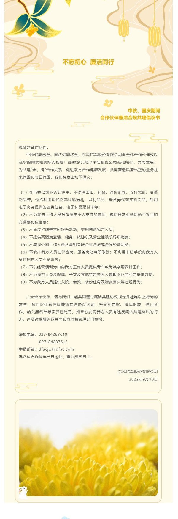 当前位置: 卡车之家 >卡车经销商 > 徐州联东汽车 > 促销新闻 > 不忘初心,廉洁同行|中秋、国庆期间合作伙伴廉洁合规共建倡议书