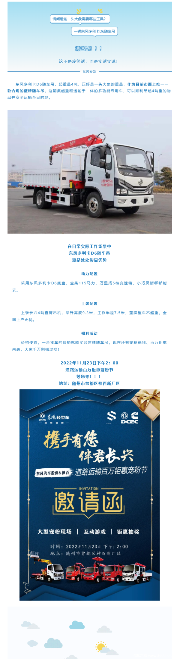 当前位置: 卡车之家 >卡车经销商 > 徐州联东汽车 > 促销新闻 > 东风多利卡D6随车吊,起重运输都在行,蓝牌更贴心!