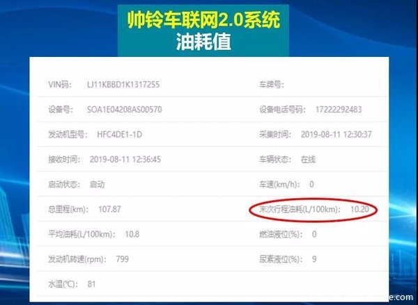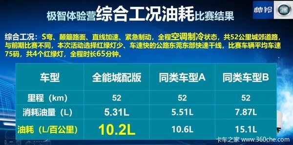 在大家最为期待的竞赛环节,帅铃全能城配版与两款同类型的轻卡展开竞争,包括S弯道、颠簸路面、直线加速、60公里城郊道路等环节。帅铃全能城配版采用车联网后台与五环仪表读数,分别测算综合工况油耗。最终以10.2L的成绩夺得冠军。