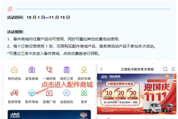 江淮卡友备件商城提供原厂正品尿素,配件等,另外值此国庆,双11节日期间,特别特推出客户感恩活动“迎国庆 欢乐送 江淮卡友超值优惠劵大放送”。江淮卡友备件商城将发放 10元、20元、30元三种优惠劵;以此来回馈和感谢卡友一直以来对我们的支持和信赖!