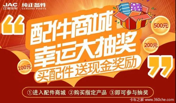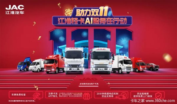 活动期间进站用户可享:①车辆免费检查;②注册江淮卡友APP分别赠送20元工时券1张,20元备件抵用券1张,可在当地服务站抵扣备件或工时费;③20分钟救援响应机制,货运无等待;④货运高峰期提供免费上门维保。(活动时间:2021年10月23日-11月30日)