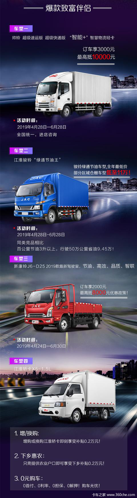 *详情请咨询当地江淮轻卡4S店,以上活动最终解释权归江淮汽车所有