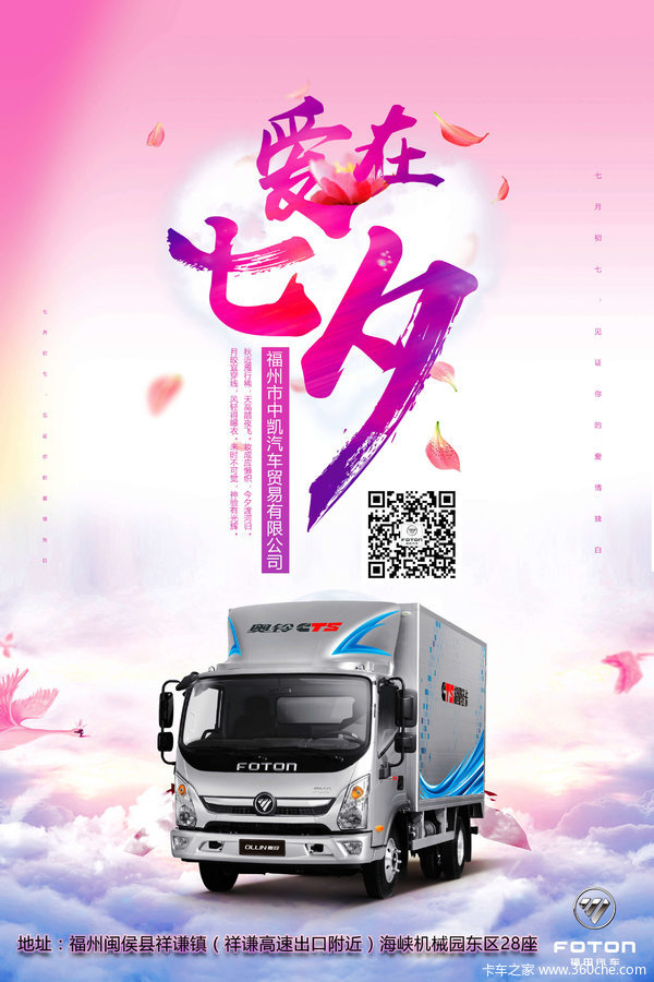 当前位置: 卡车之家 >卡车经销商 > 福州鼎腾汽车销售 > 促销新闻 > 福州中凯奥铃祝卡友卡嫂七夕快乐