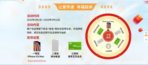 5月1日-5月31日,在天猫福田汽车官网旗舰店留下姓名 电话 意向车型等信息,并选择经销商,提交信息后即可在店铺参与抽奖活动,最高可抽取一等奖iPhone XS Max.