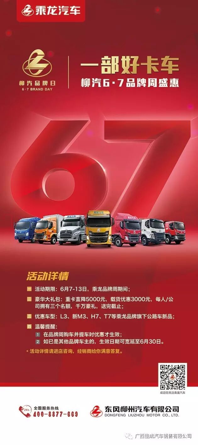 首届柳汽品牌日、千万钜惠来袭。广西佳成汽车销售有限公司诚邀您参加首届柳汽品牌周活动,重卡优惠5000、中卡优惠3000,优惠多多、先到先得。时间6月7日至6月13日,详情请来店/电垂询,地址:防城港市港口区东兴大道石板田、电话:0770-2826650