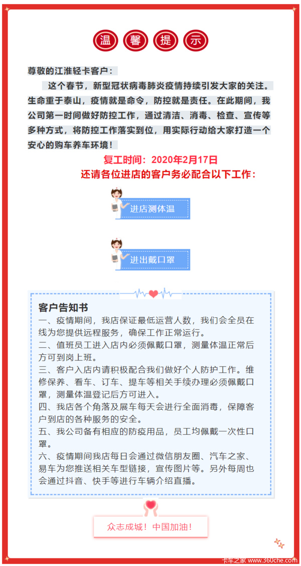 当前位置: 卡车之家 >卡车经销商 > 宁波市捷顺汽车销售服务(骏铃4S 店) > 促销新闻 > 【复工通知】宁波江淮轻卡4S店17日正式复工
