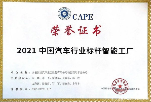 近日,以“数字赋能·智造未来”为主题的2021年中国汽车行业标杆智能工厂交流大会暨第十一届全国汽车行业智能装备管理创新论坛在湖北宜昌举行,会上发布了 “2021年中国汽车行业标杆智能工厂”榜单,江汽集团轻型商用车制造公司实力上榜。
