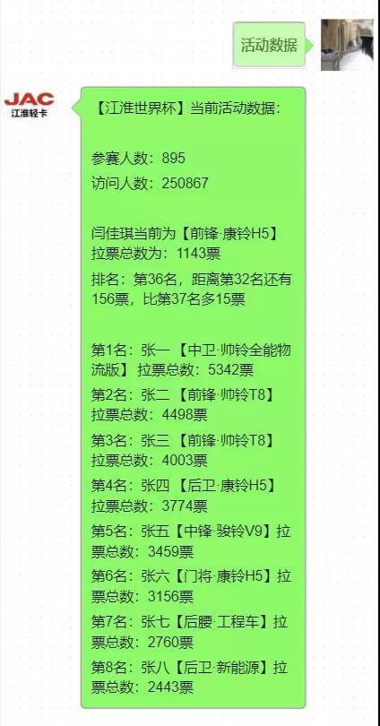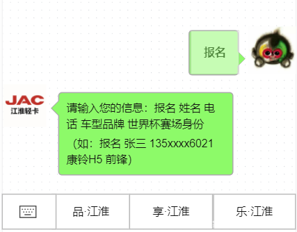 ②按照活动规则,发送消息“报名 姓名 电话 车型品牌 世界杯赛场身份”到【江淮轻卡】公众号-> 收到系统回复后即为报名成功。