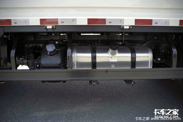 实拍车辆配备了100L的铝合金油箱,按照百公里油耗13L计算,100L油箱能够带给我们将近800公里的续航,完全能够满足频次较高的城配运输。