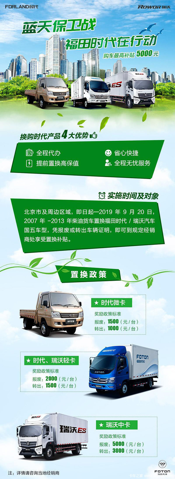 除此之外,福田时代还为北京市及周边区域的卡友准备了丰厚的老旧车辆置换福利。凡北京地区符合淘汰方案的车辆,完成报废或转出高排放老旧柴油货运车的客户,凭相应证明换购福田时代产品(详情请咨询当地经销商),除了享受政府补贴外,还可额外享受福田时代提供的购车补贴,最高可获得补贴