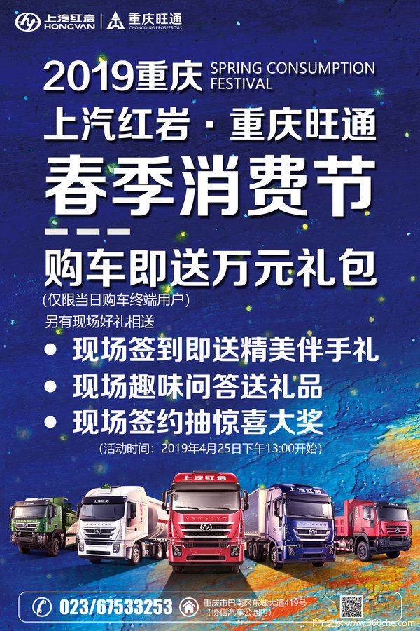 当前位置: 卡车之家 >卡车经销商 > 重庆旺通汽车销售 > 促销新闻 > 2019上汽红岩·重庆旺通·春季消费节