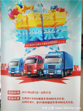 2017年6月10日——8月31日凡在常州一汽联合贸易有限公司购买V卡8*4载货车享8888元大礼包,购龙V、龙VH系列载货车享3888大礼包。联系电话:13961219083 15261112755