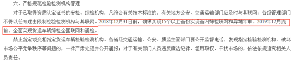 2018年12月31日前,确保实现15个以上省份实现省内综检联网和异地年审。2019年12月底前,全面实现货运车辆综检全国联网和通检。