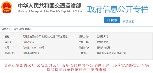 2018年09月30日,交通运输部办公厅、公安部办公厅、市场监管总局办公厅发布关于进一步落实道路货运车辆检验检测改革政策有关工作的通知。