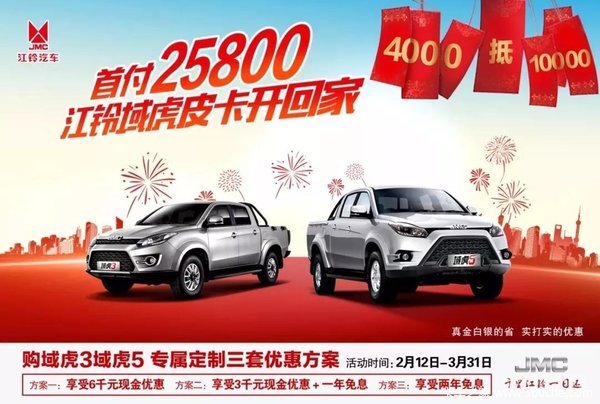2月12日-3月31日,江铃汽车针对旗下明星皮卡品牌——域虎家族,推出购域虎3 域虎5可享受专属定制优惠方案的优惠活动,购车补贴高达6000元。