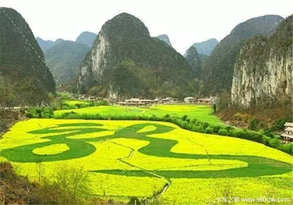 贵州油菜花随着当地的喀斯特地貌来分布,从贵阳出发经关岭、安顺到普定,一直到夜郎湖一带,都种上了油菜。层层叠叠,蜿蜒伸延,构成了奇异的画面,犹如每个山头都披上了一件挂毯,十分好看。