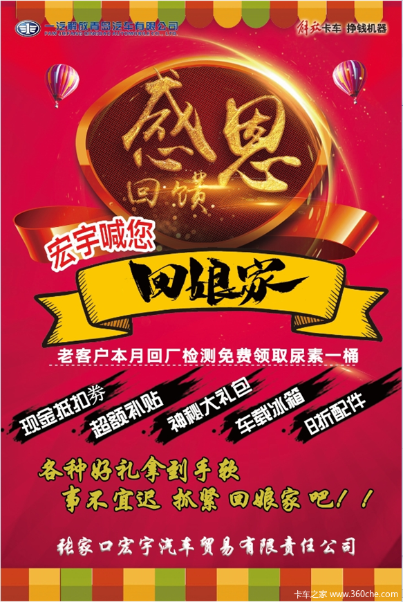 当前位置: 卡车之家 >卡车经销商 > 张家口宏宇汽车贸易有限责任公司 > 促销新闻 > 感恩回馈张家口宏宇喊您回娘家啦!限时一周!