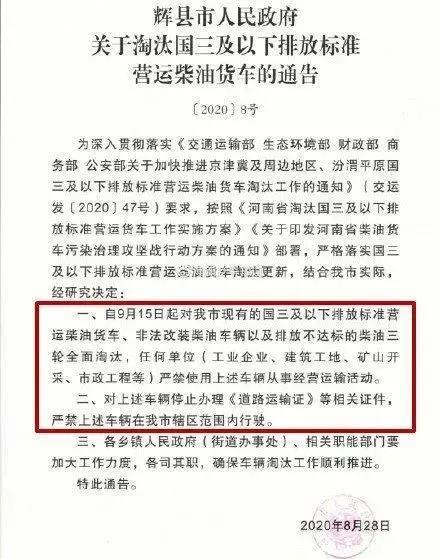 日前,河南辉县市人民政府发布公告称:禁止任何单位使用国三车、非法改装车以及不达标的车辆从事运输。除此之外,对上述车辆还禁止办理通行证。