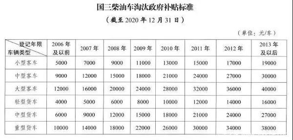 根据淘汰车辆的车型、使用年限给予差别化政府补贴,补贴标准为:国三柴油车4000-40000元/车,时间截止到2020年12月31日。