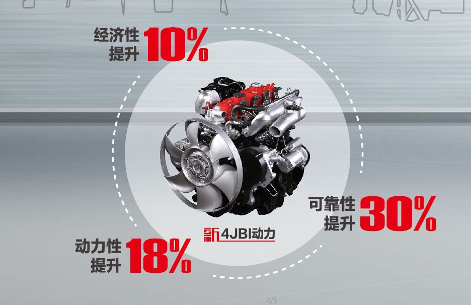 基于50万台市场保有量,全新升级的4JB1发动机,模块化设计,零部件数量减少,高强度合金钢锻造曲轴,铝合金材质齿轮室、气门室罩,结实耐用,发动机基础件质保5年55万公里。