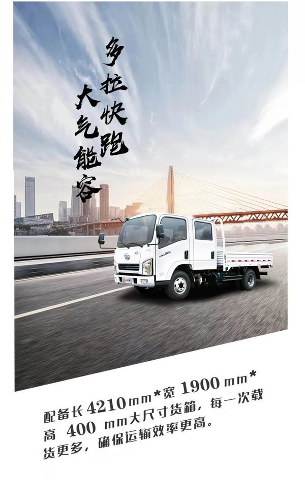 一汽红塔解放公狮S1超大的货箱尺寸,比其它同级车型多装多个标准3号快递包裹箱,拉货一步到位;有着城配速运之王之称,在竞争激烈的城配运输市场,能以绝对的优势胜出。