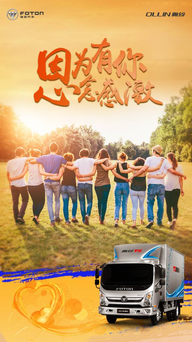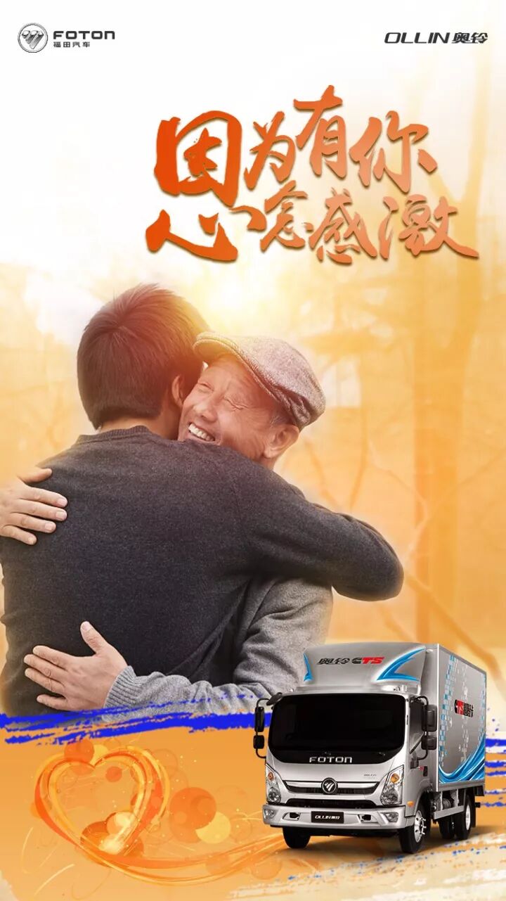 感恩有你,我们有了奥铃CTS超级轻卡动力、可靠、舒适、高效的四大突破;感恩有你,我们有了奥铃EV纯电动超级轻卡的清新纯净;感恩有你,我们有了奥铃TS轻卡的持久韧性。