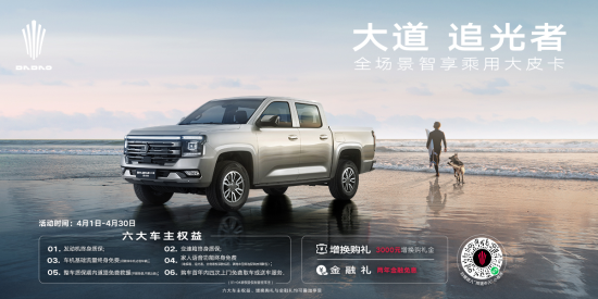 随着皮卡政策和市场环境明显改善,越来越多用户选择皮卡来满足多元化用车需求,江铃大道顺应时代需求,不仅推出全场景大皮卡,颠覆皮卡生活方式,还持续为用户送上购车豪礼,诚意满满。对江铃大道感兴趣的用户们,即日起-4月30日,赶紧去领取江铃大道的多重福利,并解锁江铃大道“产品天团”的独特魅力吧!