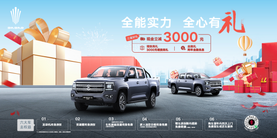 同时,为打造更强悍越野实力,该车采用行业首创滚压成型的方钢纵梁,做到行业第一的183mm横截面厚度,铸就了铮铮铁骨;皮卡行业首创多连杆+瓦特连杆后悬黄金组合,为用户带来更舒适、从容驾乘体验;行业最长220mm底盘悬挂行程,轻松征服炮弹坑、起伏路等;三把锁、蠕行掉头、蠕行模式、博格华纳分时四驱系统、上坡辅助、陡坡缓降等越野科技,让该车轻松应对各种路况和越野环境。