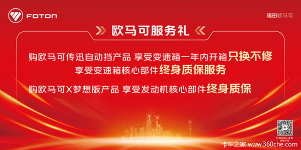 在服务礼方面,欧马可也给足了惊喜。即日起至6月30日,欧马可自动挡产品1年内变速箱只换不修,7大部件享受终身质保;此外,还有福康发动机保养、欧康4年或20万公里发动机基础保养及动力电池8年60万公里超长质保等多种服务礼,数量有限,先到先得。此外,更有系列暖心服务、尊享预见性智能服务,以优质服务为用户高效畅行保驾护航。