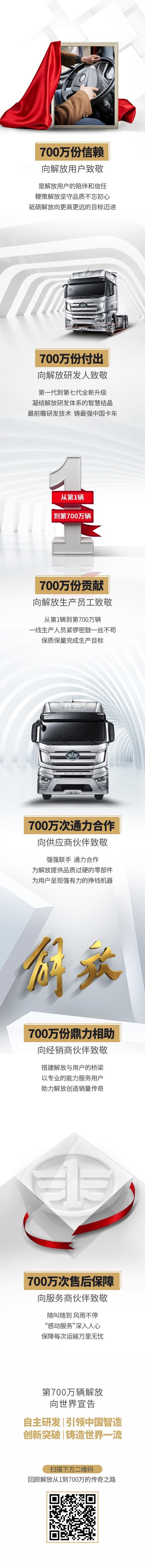 2018年1-10月份,解放已累计销售整车29.1万辆,中重市场份额21.1%,龙头地位持续稳固。未来,解放要实现2020年销售35万辆、2023年43万辆,2025年50万辆的宏伟战略目标。以J7为代表的解放产品,不但要在中国实现“替代进口”,未来更要打入欧洲市场,与世界知名重卡同台竞技。700万辆,是解放发展历史上的一座里程碑,更是解放面向未来的一个新起点。在“信、智、益”品牌理念的指引下,一汽解放正致力于成为 “中国第一、世界一流”的智慧交通运输解决方案提供者,谱写新时代中国汽车工业高质量发展的新篇章!