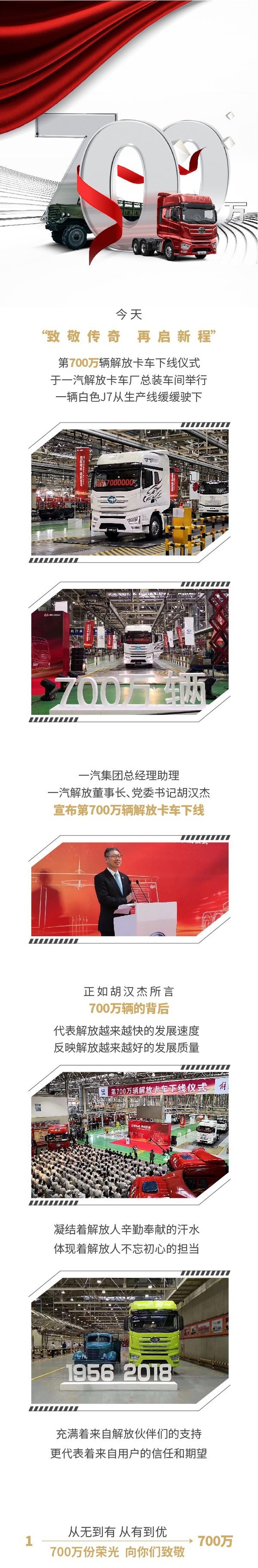 跻身世界一流之列 解放品牌再创辉煌回首过往,峥嵘岁月。展望未来,锦绣前程。从1956年第一辆解放CA10的诞生,到2018年第700万辆驶下生产线,经历了七代车的更迭、七百万的跨越,解放见证了中国汽车工业从无到有、从弱到强的翻天巨变,也见证了中国民族品牌从引进到创新、从跟随到领航,快速迈向世界级品牌的崛起之路。