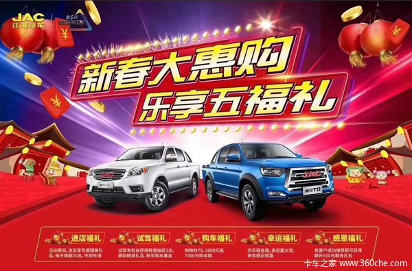 当前位置: 卡车之家 >卡车经销商 > 甘肃仕恒源汽车销售 > 促销新闻 > 交1000抵7000,江淮皮卡五福礼遇新春!