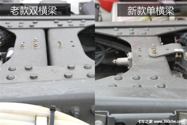 重汽新推出的这款540马力的车型,在车架上也做了一系列的轻量化处理。在不改变车身强度的情况下,新款车型的车架中部的横梁由原来的两根变为一根,安装结构也作了一系列的调整。