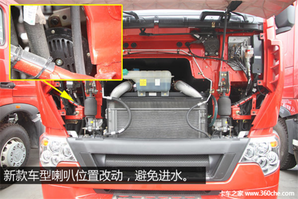 有不少的卡友吐槽,原来老款车型安装在轮胎旁边的喇叭容易进水。新款车型在这些方面也有所调整,喇叭位置挪到了前面罩内,几乎再也没有进水的可能。