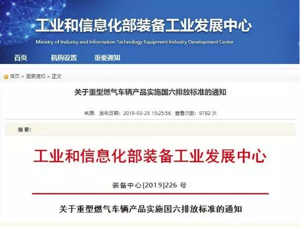 2019年3月25日,工信部发布《关于重型燃气车辆产品实施国六排放标准的通知》,里面提到重型燃气车辆产品将于2019年7月1日执行国六a阶段排放要求,装备工业发展中心拟于6月开始清理审查工作。