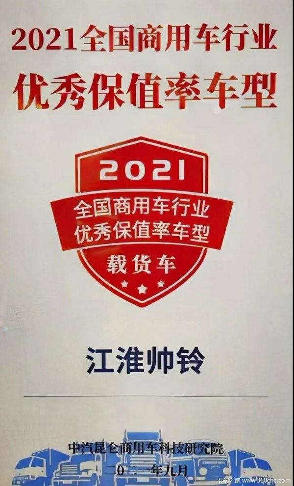 在“全国商用车行业主流车型3年期保值率-轻型货车”评价板块中,作为中国高端轻卡领军品牌,帅铃全能卡车以61.80%保值率荣获“2021全国商用车行业优秀保值率车型”奖项。
